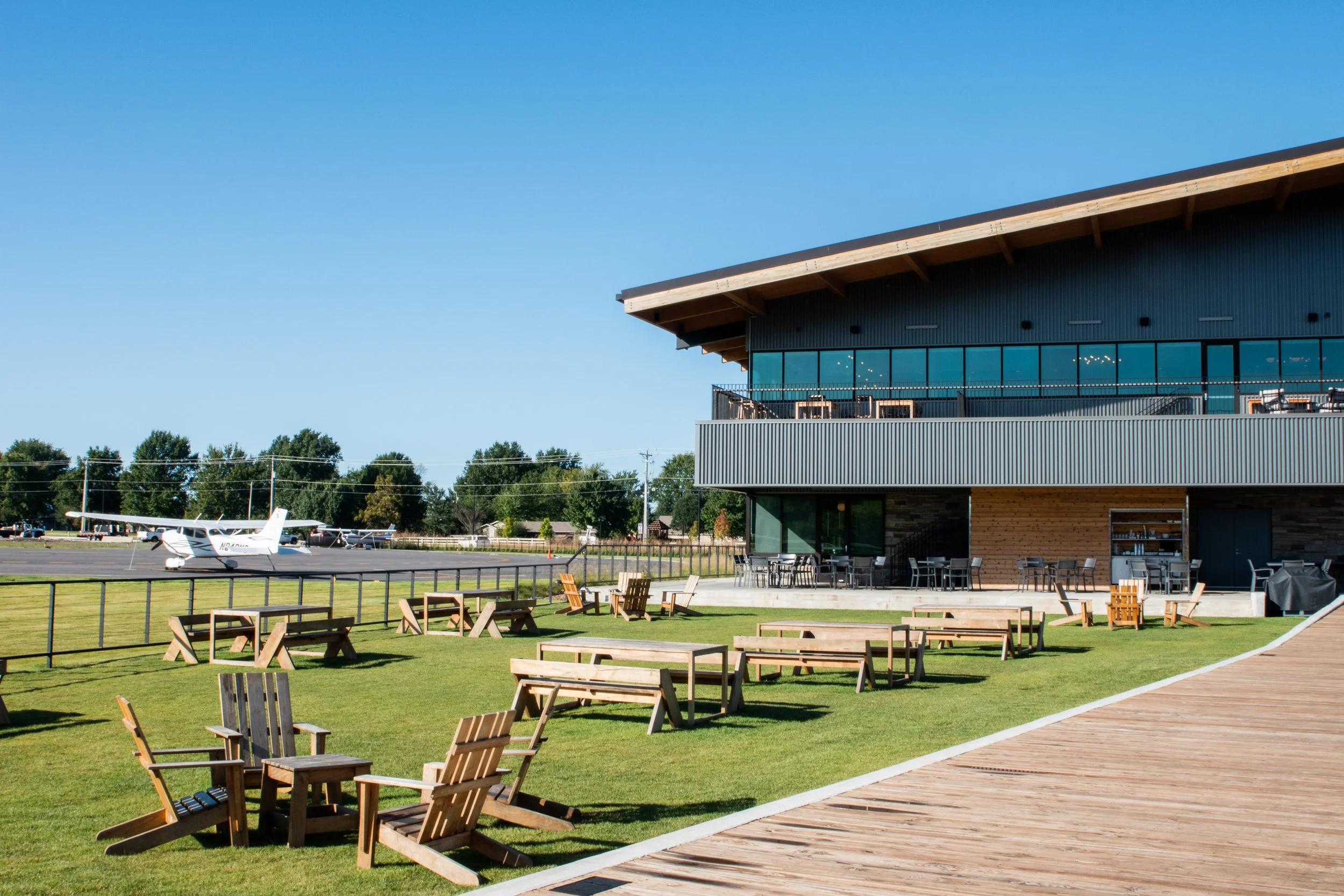 Our restaurant, patio, lawn, and hangar are available, providing fantastic indoor and outdoor seating options.